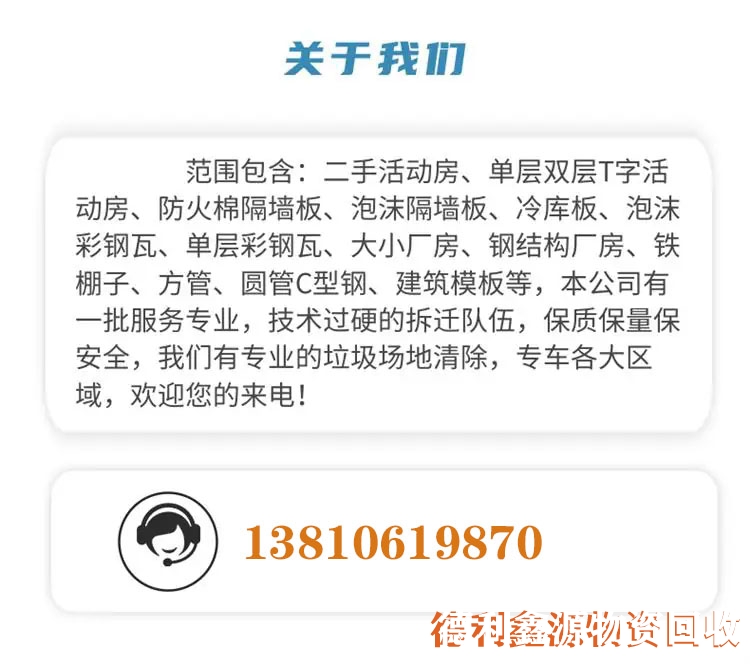 提供彩鋼房、活動(dòng)房等回收拆除服務(wù),涵蓋廢舊設(shè)備、金屬、工業(yè)設(shè)備、電力設(shè)備、制冷設(shè)備、鋼結(jié)構(gòu)等。服務(wù)范圍覆蓋北京多區(qū)及周邊,可承包大跨度廠房等廢舊資產(chǎn)回收。