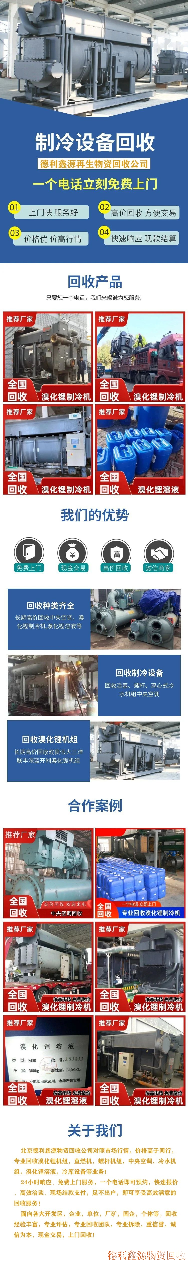 北京德利鑫源物資回收公司對照市場行情,價格高于同行,專業回收溴化鋰機組,直燃機,螺桿機組,中央空調,冷水機組,溴化鋰溶液,冷庫設備等業務!24小時響應、免費上門服務。